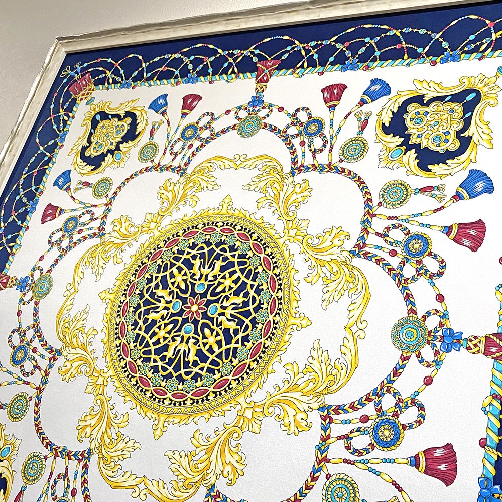 世界最高水準の技術で作られる「横浜スカーフ」の、ビーズタッセルと名付けられたスカーフです。対称性のあるスカーフらしいデザインで、時や場所が変わっても色褪せない普遍的な美しさが気に入っています。このスカーフには、どんな額縁が似合うのかな?