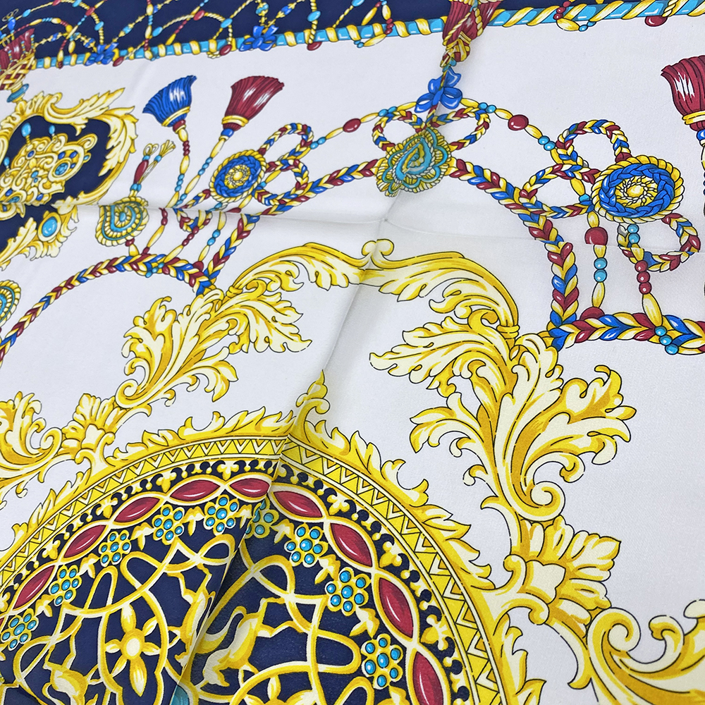 スカーフは薄いシルク地なので、[真四角の状態=正確な図案]にはなっているとは限らず、スカーフの時点で図案(絵柄)に歪みがあるのが普通です。スカーフのデザインの意図を汲み取り、微妙な調整で再現するセンスが求められます。