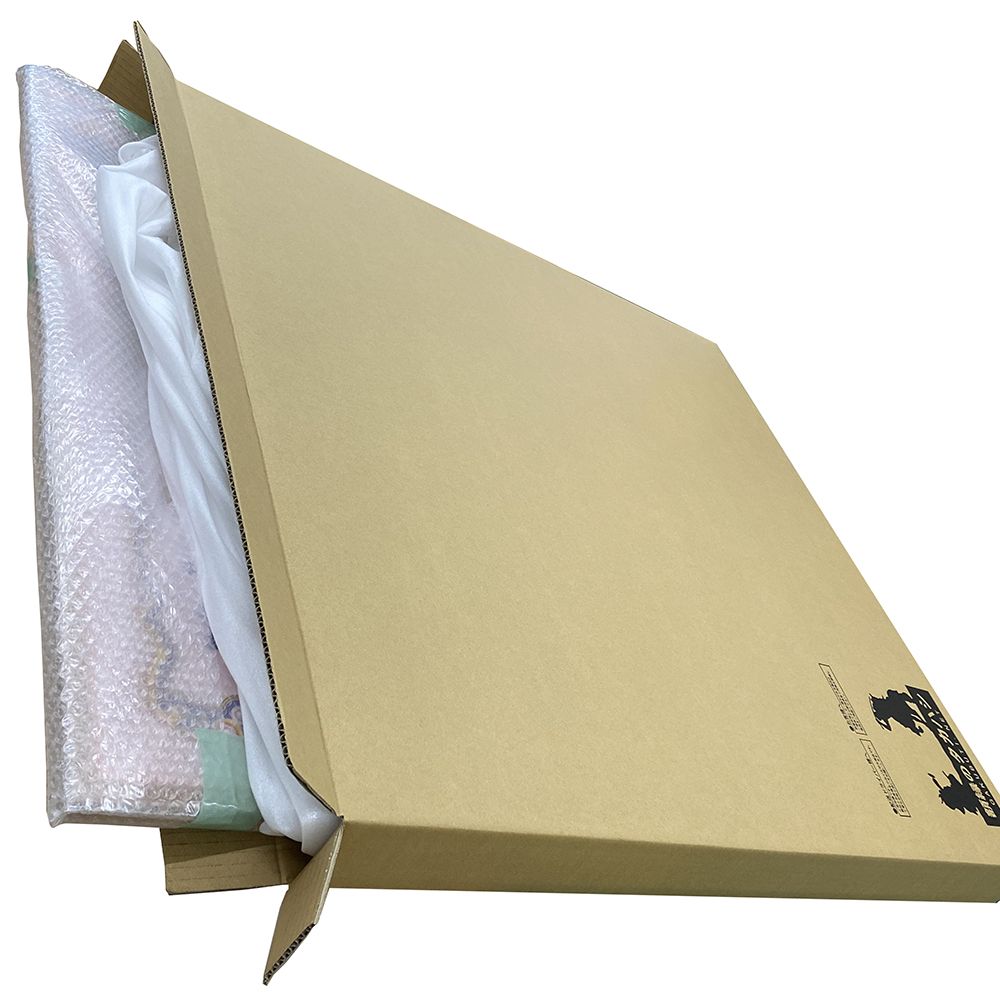 スカーフ額はエアキャップか段ボール箱に入った上で、さらに外装となる段ボールに入れられて荷造りされます。カッターなどで中身を傷つけないよう、注意して額縁を取り出してください。