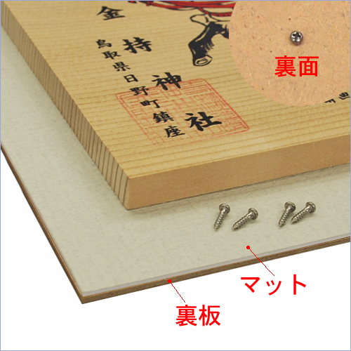 お使いになるネジの長さにご注意ください。ネジが品物を表まで貫いてしまうと台無しです。左では額縁の背景にマットを採用しました。裏板とマットをネジで貫いて留めています。