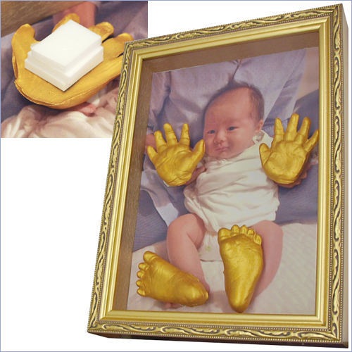 背景として、A4サイズの写真を用意。たわまないように全面を貼り付けました。紙粘土の手形と足形を土台に乗せ、写真の上に貼り付け固定しています。