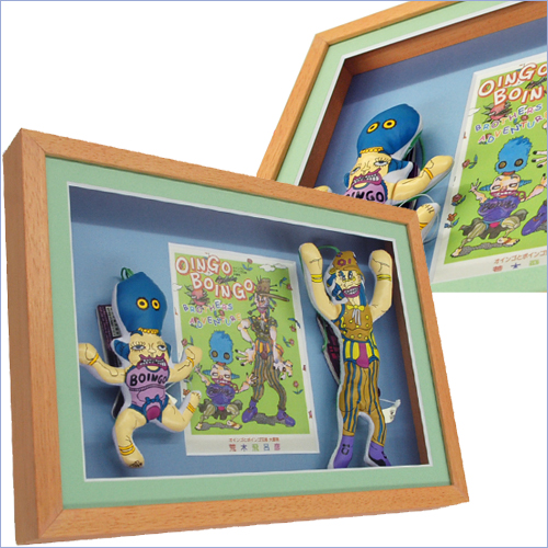 前面と背景に窓抜きしたマットを採用。タイトルを背景マットの窓抜き部分にセット。ビニール人形を背景両脇に両面テープ留め。タイトルは本の表紙のカラーコピーです。