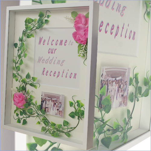 立体額で作ったウェルカムボードです。背景にクリーム色の窓抜きしたマットを配置。印刷物のタイトルを窓抜き内にセットしました。会場イメージの写真は「浮かして」います。造花はポイントごとに縛って固定。