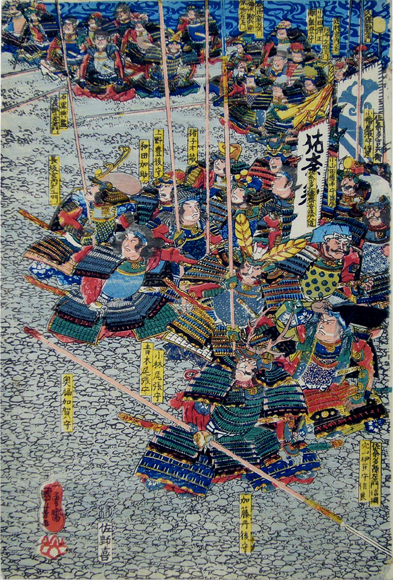 る作品。まさに武者絵の国芳と言われた面目躍如である。 画面中央で信玄と向かい合う初鹿源五郎(この合戦で討死)が背負うのは、むかで隊の旗。これは信玄が金掘衆の技能を生かし、トンネルを掘ったり、敵の井戸や掘の水抜きなどの特殊な任を与えて組織したものである。歴史の表舞台にはなかなか現れないこうした者達が、実は信玄の軍資金(甲州金)や城崩しなどに大きな力を発揮したのである。 |