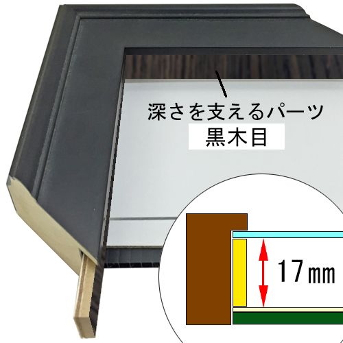 このフレームは「フレーム深さを活かした立体額」の製作も可能です。上の画像では、「フレーム深さを活かした立体額」を製作した場合の、額縁内部深さや深さを支えるパーツの色も紹介しておりますが、オーダーフレームの仕様によって額縁の構造は変わりますのでご注意ください。