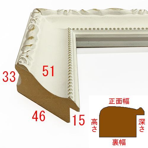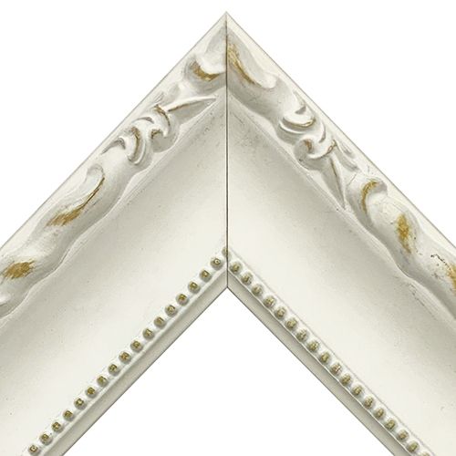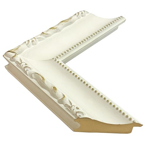 木製、オーダー製作専用フレーム。安定感のある形状、つや消し白の額縁。所々で下地の木地を磨き出しています。