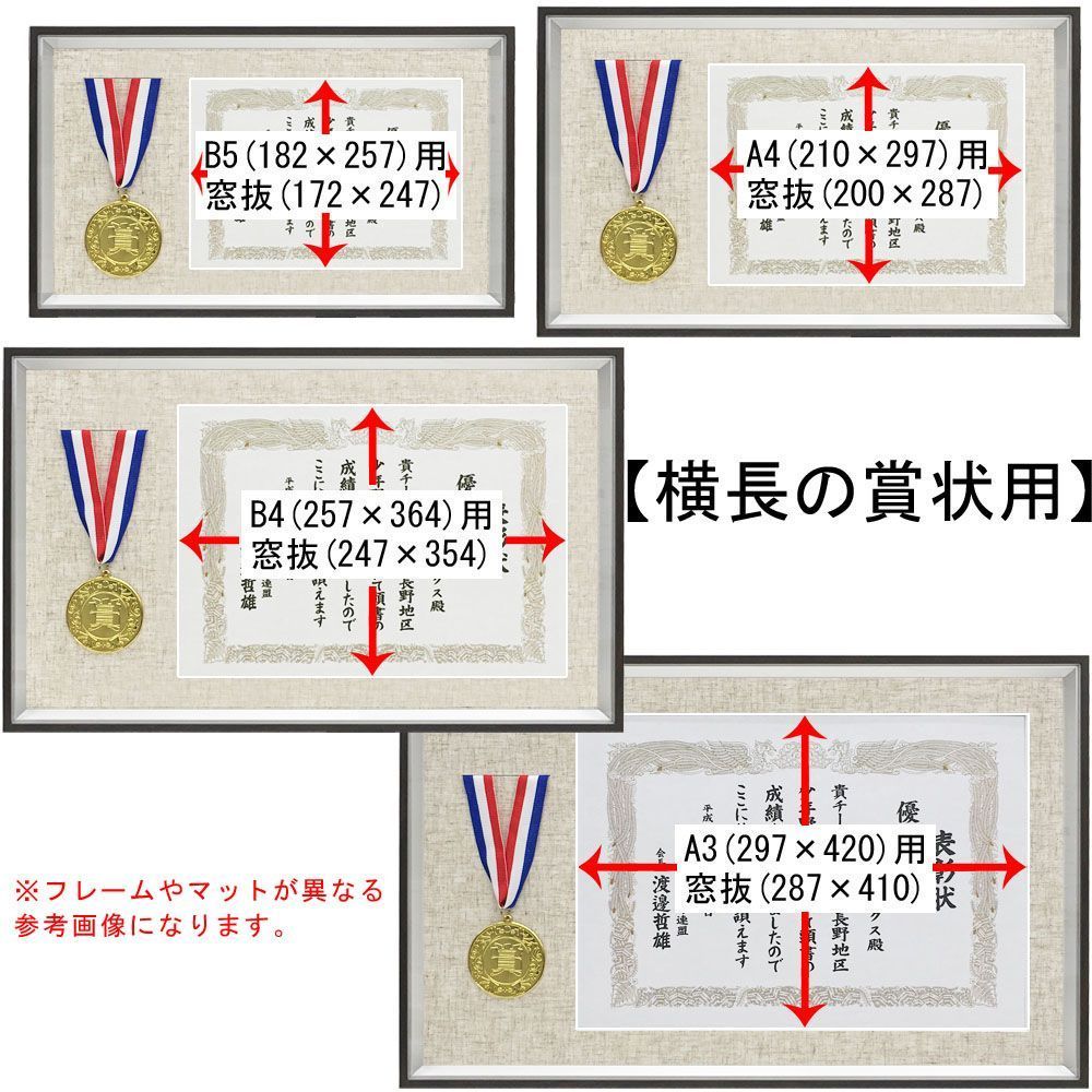 この額縁は窓抜きされたマットが付属します。賞状にマットを被せて額縁に入れましょう。「窓抜寸法」が賞状の見える部分になります。下に記載の仕上がりイメージをご確認ください。