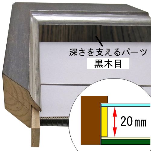 このフレームは「フレーム深さを活かした立体額」の製作も可能です。上の画像では、「フレーム深さを活かした立体額」を製作した場合の、額縁内部深さや深さを支えるパーツの色も紹介しておりますが、オーダーフレームの仕様によって額縁の構造は変わりますのでご注意ください。