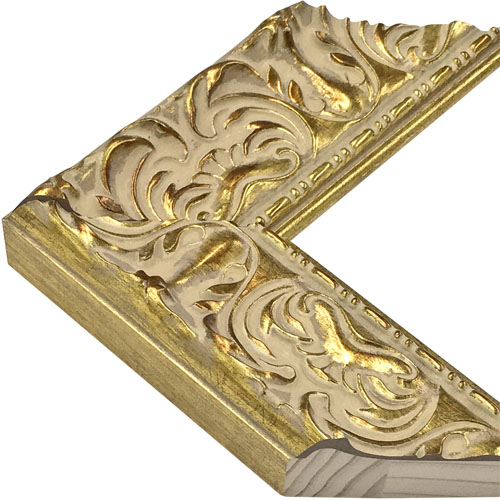 木製(パイン材)、オーダー製作専用フレーム。大柄な彫り模様を施した型物の額縁です。燻しによるコントラストで模様が際立ちます。暖色が強めの温かみのあるゴールド色。