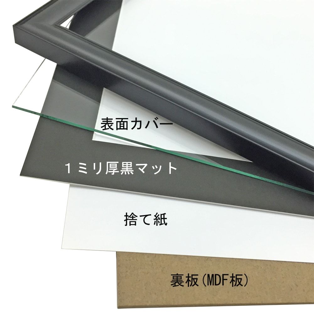 この額縁は窓抜きされたマットが付属します。飾る品物にマットを被せてセットしましょう。下部表のマット窓抜寸法をご確認ください。 窓抜寸法やマット色を変更する場合は、こちらから別途マットをお求めください。額縁内部深さの関係で、1.5mm厚以下のマットが適正となります。