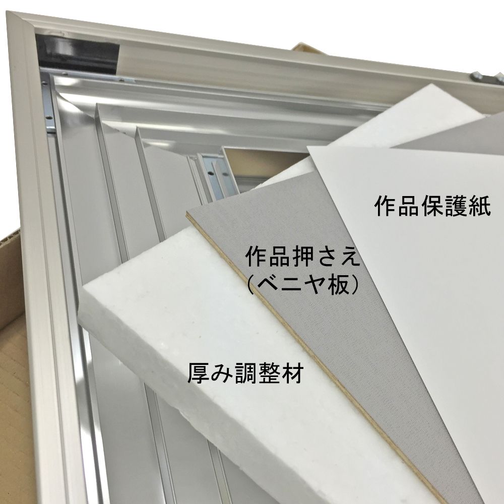 油絵額は絵画規格サイズで作られています。飾る作品と同サイズの額縁を選びましょう。はめ込み部分にはゆとりがあるので、1-2mmの誤差は問題ありません。セット方法については、こちらの動画でご紹介しております。