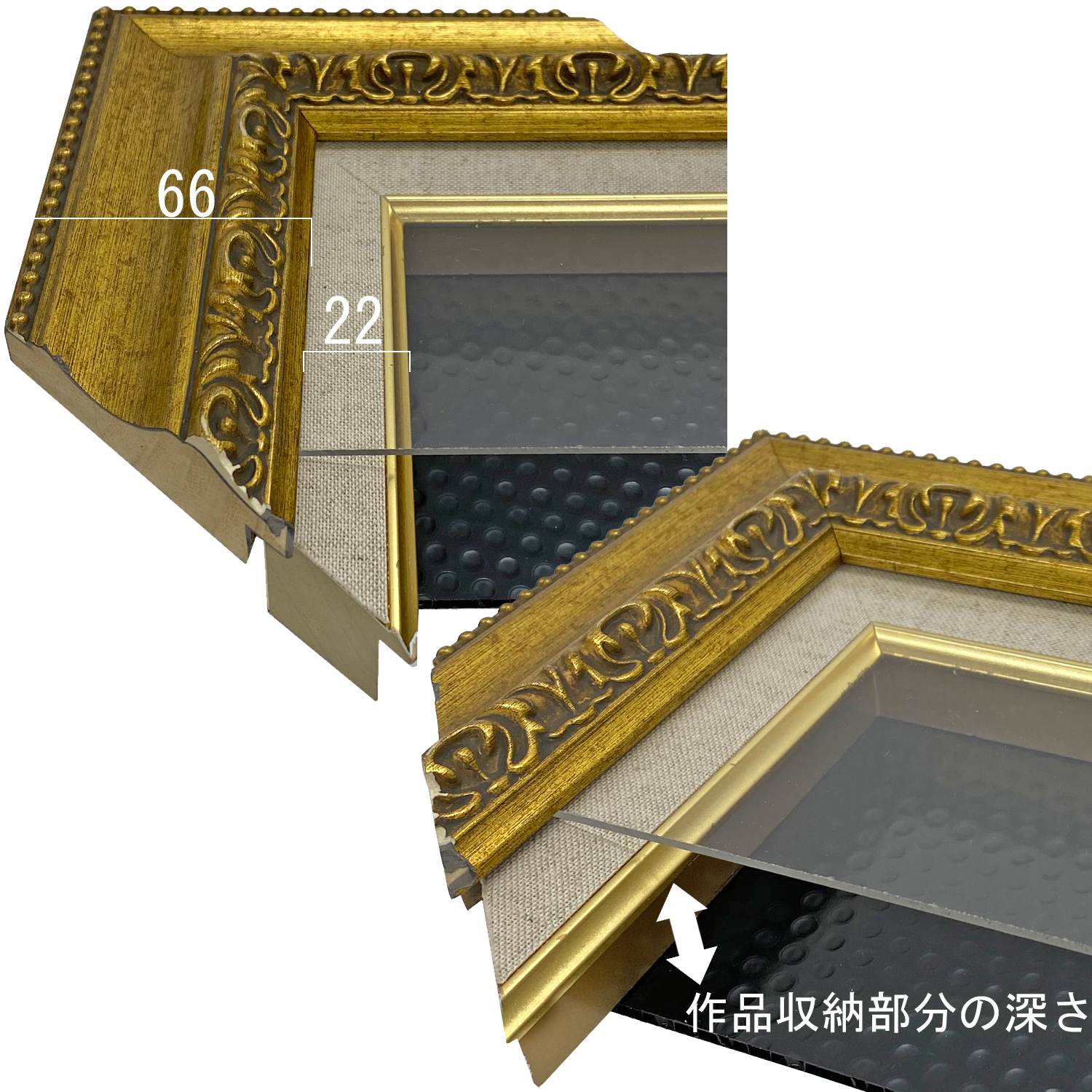 構造上、収納部のサイズ調整は困難です。規格外の作品には、こちらから特注サイズでご注文ください。