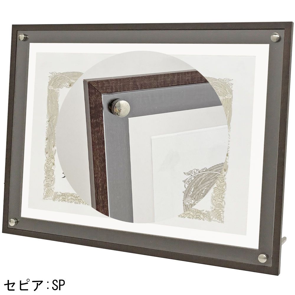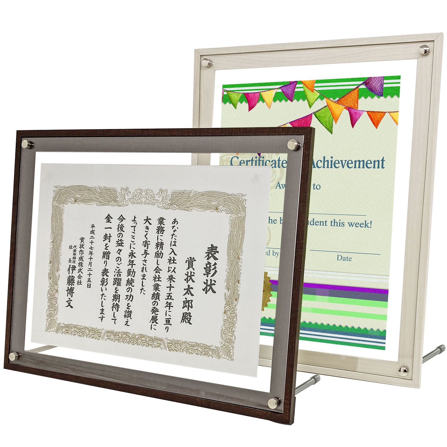 木製フレームの中心に賞状が浮かぶおしゃれな額縁