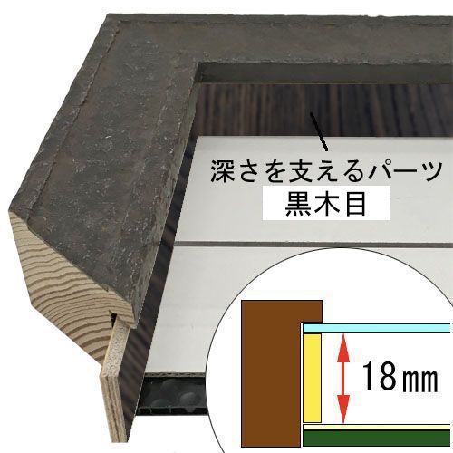 このフレームは「フレーム深さを活かした立体額」の製作も可能です。上の画像では、「フレーム深さを活かした立体額」を製作した場合の、額縁内部深さや深さを支えるパーツの色も紹介しておりますが、オーダーフレームの仕様によって額縁の構造は変わりますのでご注意ください。