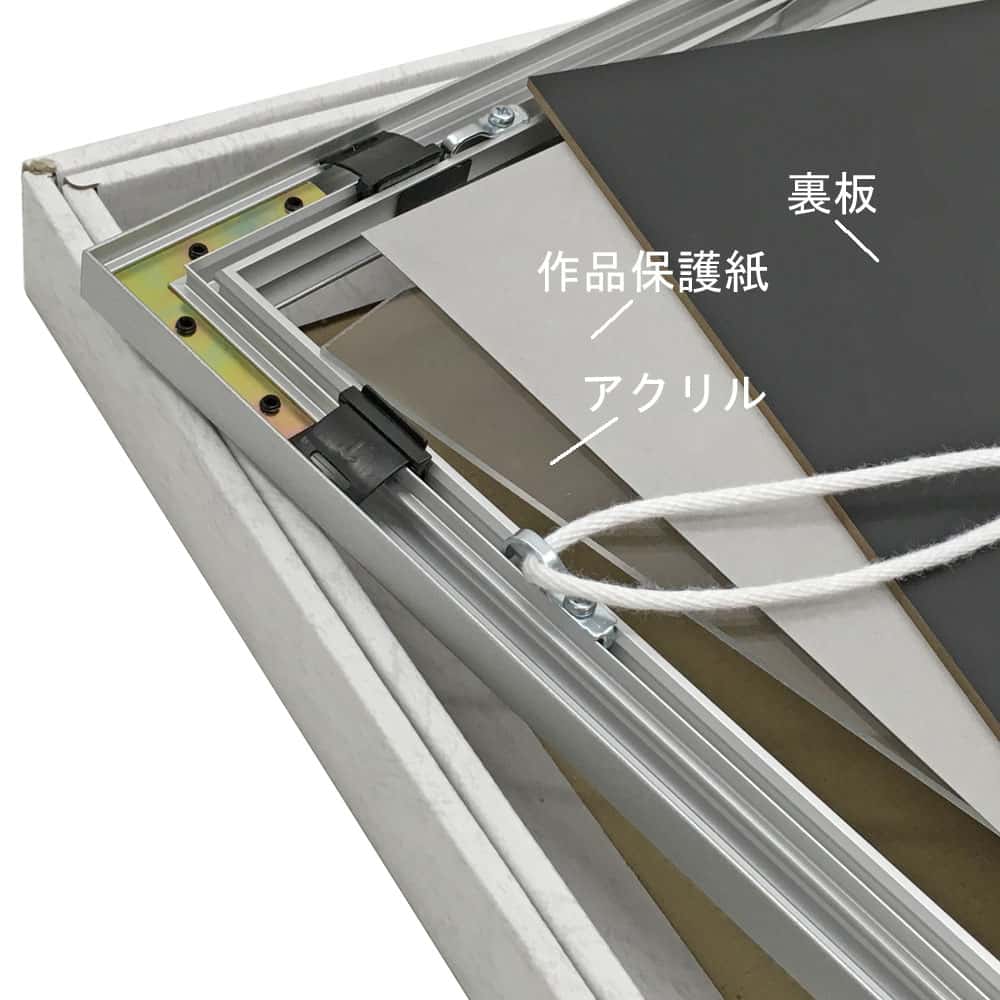 一般額・MH-510Jを特注サイズでご用意。角ばった形状でアルミの質感が際立つ額縁。余裕のある太さで安定感があります。木材に比べ、均一で安定した品質、色合いを誇ります。