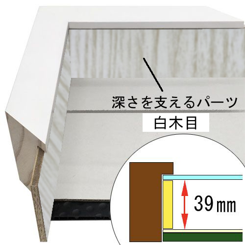 このフレームは「フレーム深さを活かした立体額」の製作も可能です。上の画像では、「フレーム深さを活かした立体額」を製作した場合の、額縁内部深さや深さを支えるパーツの色も紹介しておりますが、オーダーフレームの仕様によって額縁の構造は変わりますのでご注意ください。