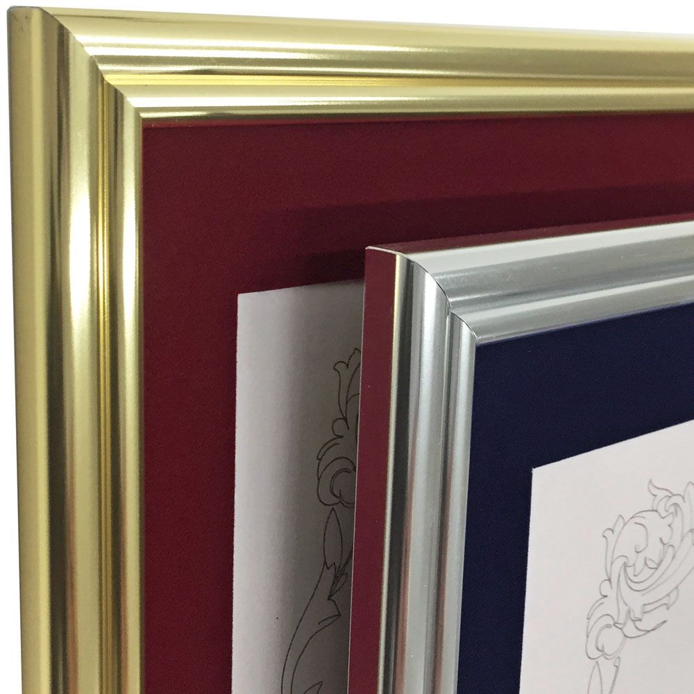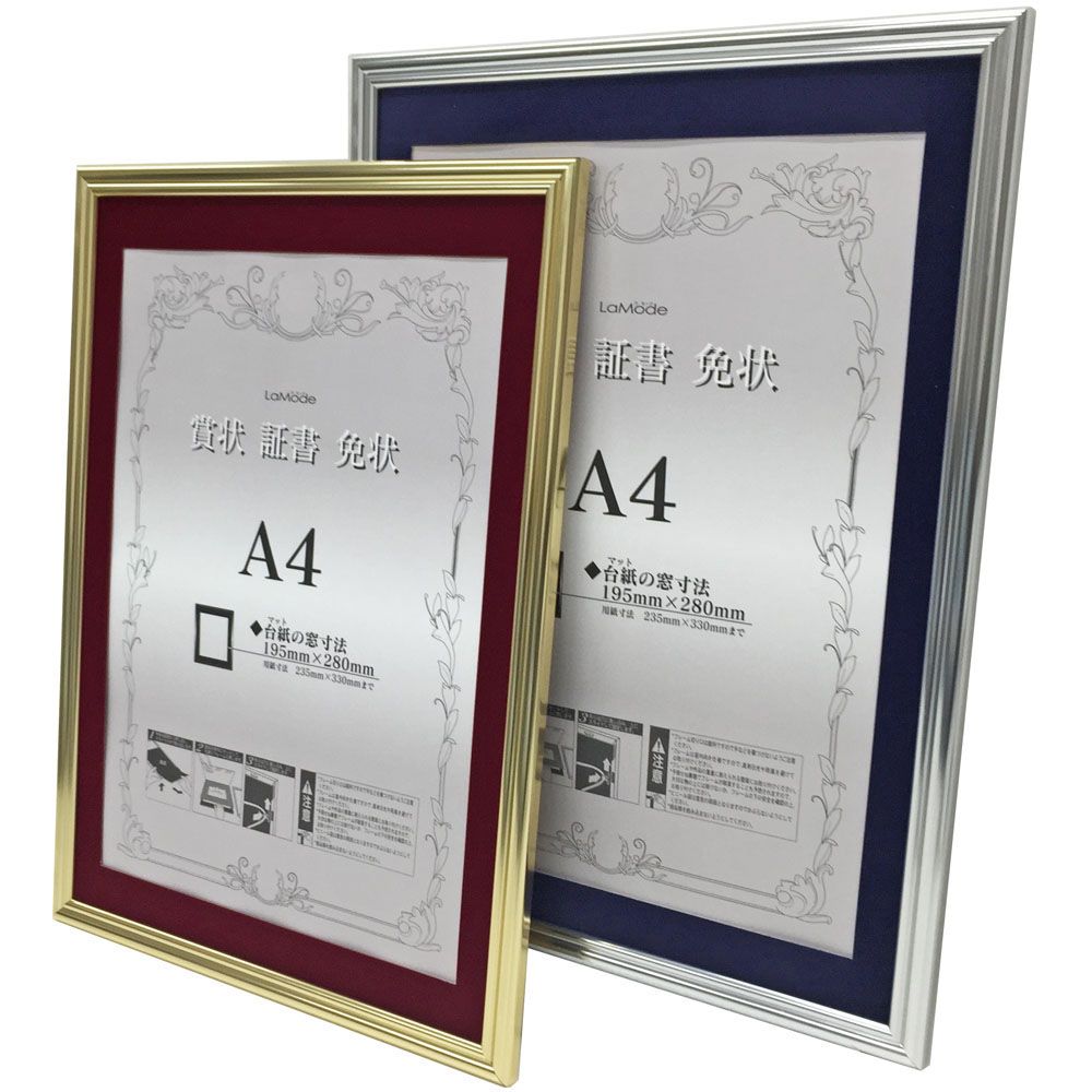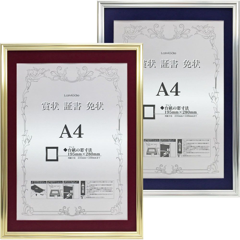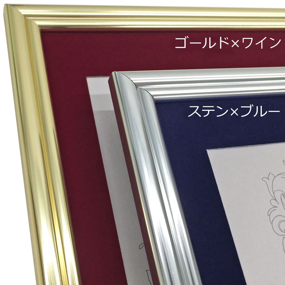 この額縁は窓抜きされたマットが付属します。賞状にマットを被せて額縁に入れましょう。「窓抜寸法」が賞状の見える部分になります。下部表のマット窓抜寸法をご確認ください。 額縁の仕様上、窓抜寸法は変更できません。別売のマットとの組み合わせも不可能です。賞状サイズが合わない場合は、一般額などの別の額縁をご検討ください。