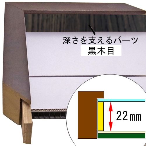 このフレームは「フレーム深さを活かした立体額」の製作も可能です。上の画像では、「フレーム深さを活かした立体額」を製作した場合の、額縁内部深さや深さを支えるパーツの色も紹介しておりますが、オーダーフレームの仕様によって額縁の構造は変わりますのでご注意ください。
