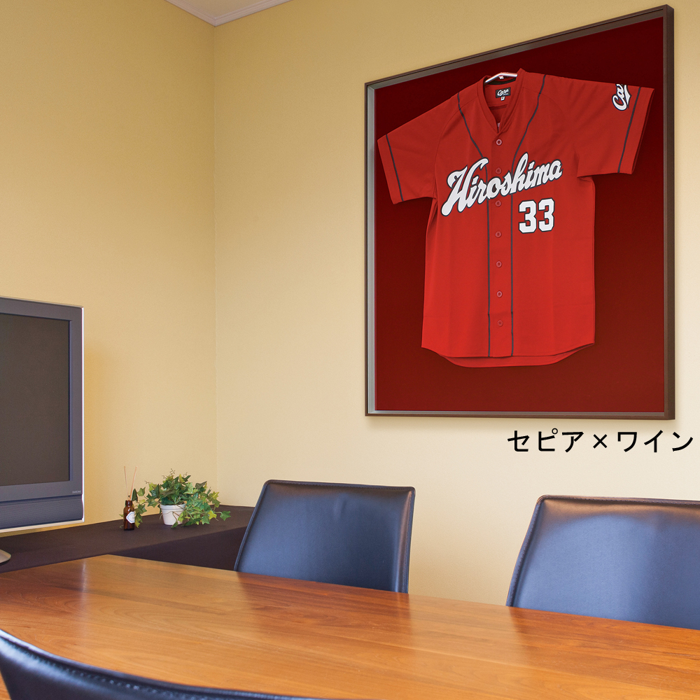 ユニフォームのサイズ表記がMでも、額縁もMサイズとは限りません。競技によってもサイズが大きく異なります。 実際にお手元のユニフォームを広げて、額縁サイズと比べてください。袖を折り返すなど、額縁の中で微調整も可能です。