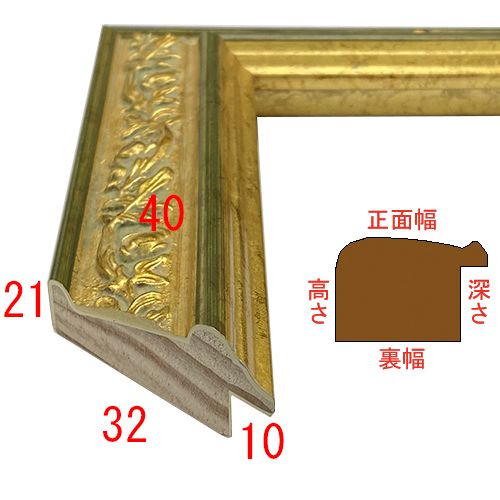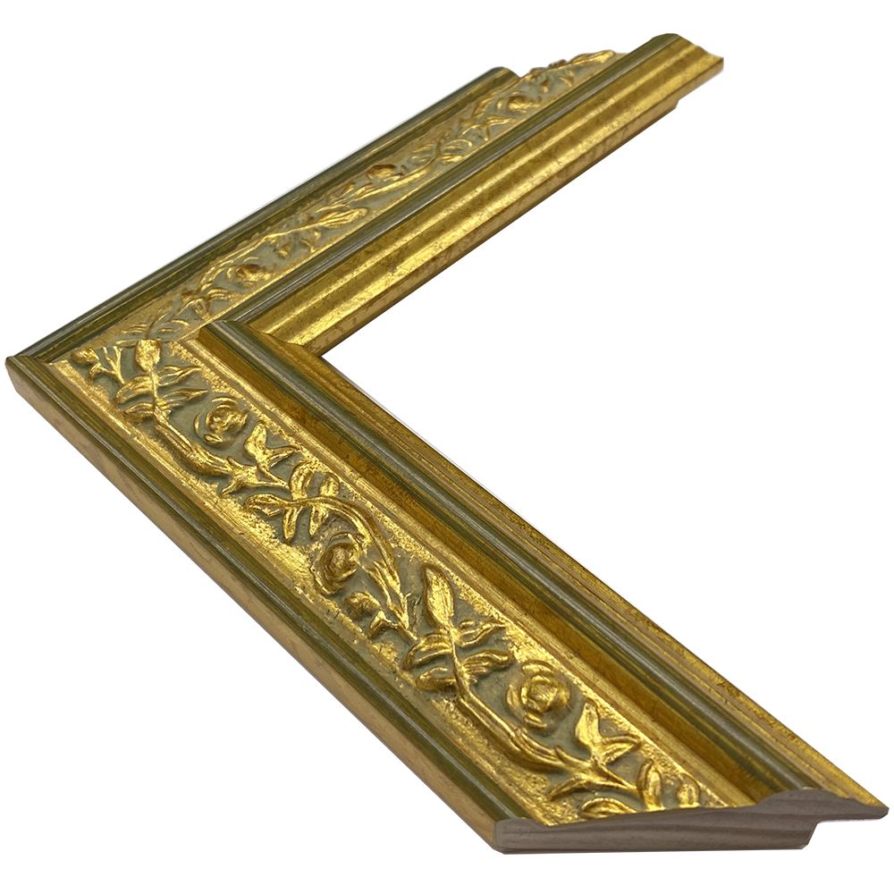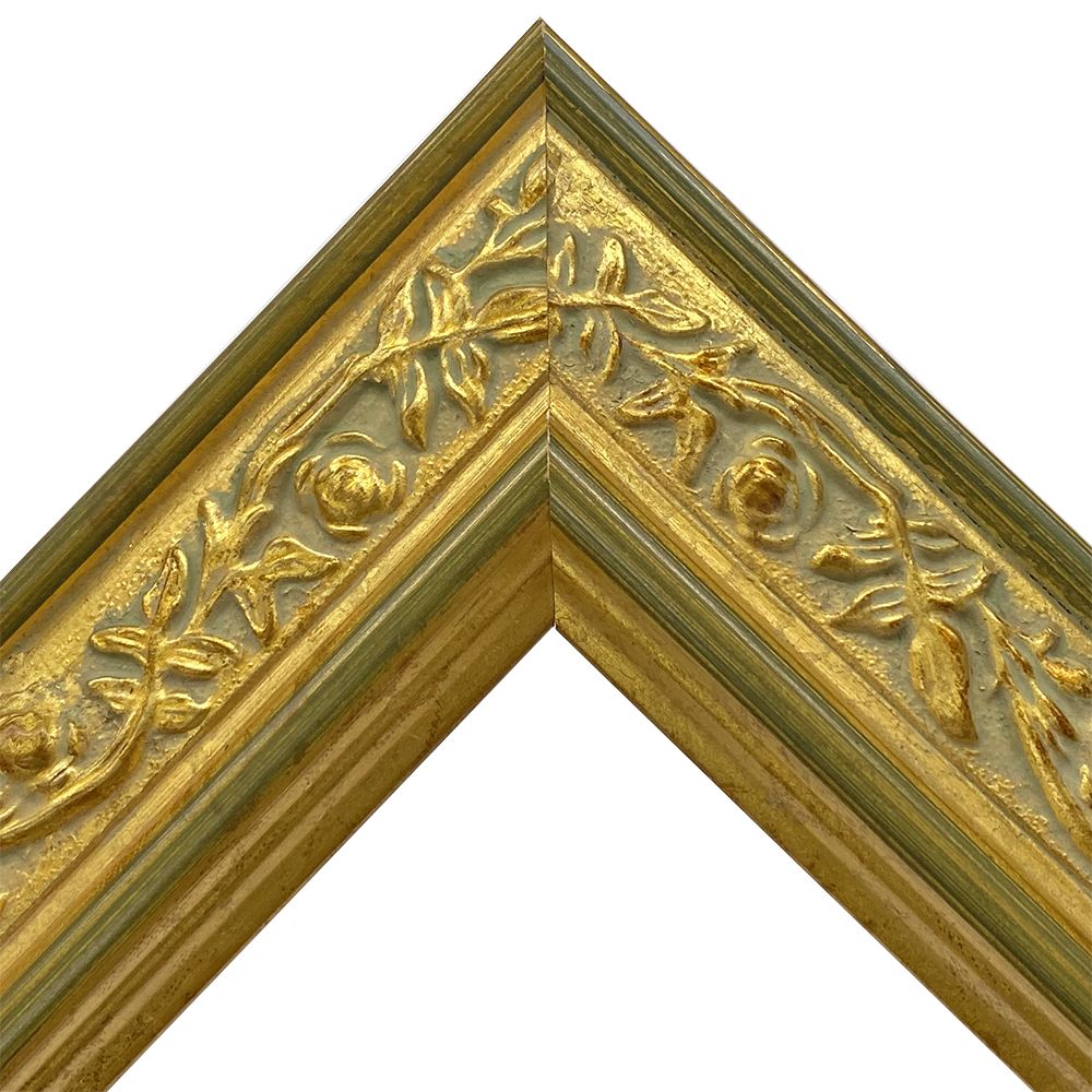 木製。オーダー製作専用フレームです。金と緑の中に花模様があしらわれた額縁。明るい色合いで華やかにお部屋を彩ります。