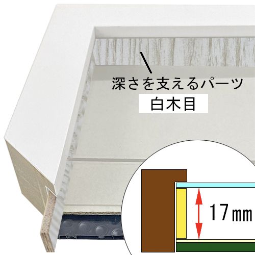 このフレームは「フレーム深さを活かした立体額」の製作も可能です。上の画像では、「フレーム深さを活かした立体額」を製作した場合の、額縁内部深さや深さを支えるパーツの色も紹介しておりますが、オーダーフレームの仕様によって額縁の構造は変わりますのでご注意ください。