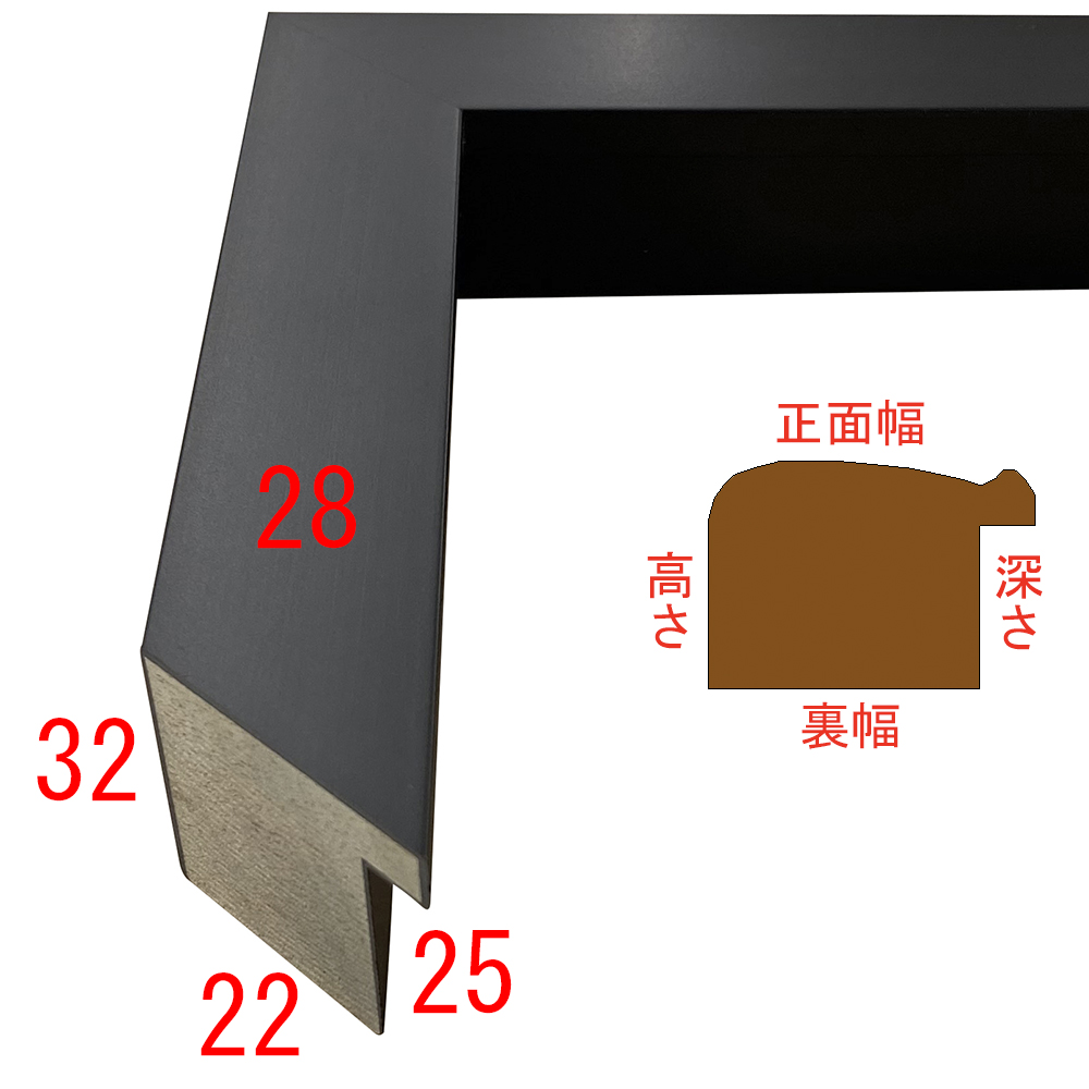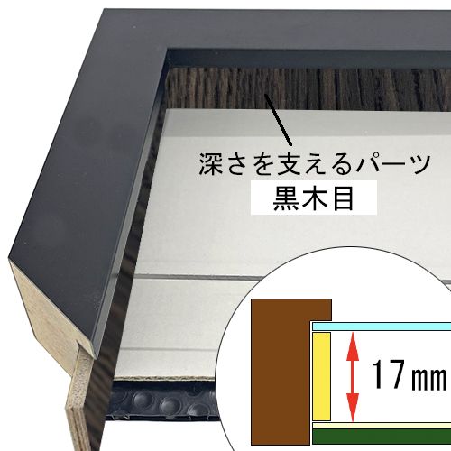 このフレームは「フレーム深さを活かした立体額」の製作も可能です。上の画像では、「フレーム深さを活かした立体額」を製作した場合の、額縁内部深さや深さを支えるパーツの色も紹介しておりますが、オーダーフレームの仕様によって額縁の構造は変わりますのでご注意ください。