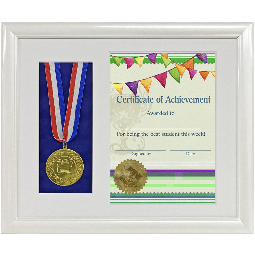 縦向きのA4サイズの賞状と、副賞のメダルをセットで飾れる