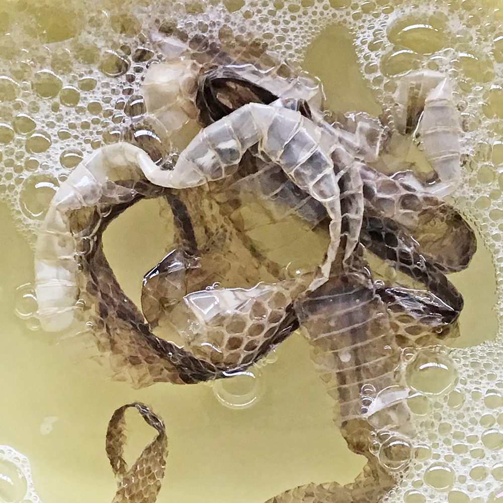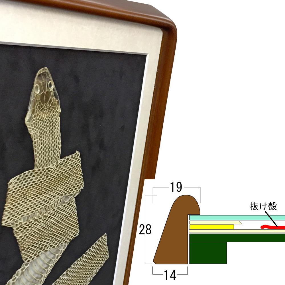 注文後、当社宛に品物をお送りください。蛇の長さに沿ったご注文となりますが、洗浄などを行うと大きくサイズが変わる場合があります。実際の抜け殻をお預かりしてから、改めて額縁の大きさなどを確認いたします。サイズの調整など、適宜ご提案を行いますのでご安心ください。