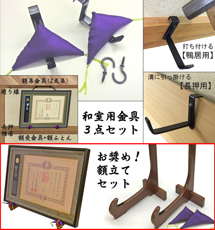 額縁と金具のセット品をご用意しております。床の間等に置く「額立てセット」が人気。和室用金具は、鴨井用と長押用があります。詳細は額縁の飾り方/和室編をご覧ください。 洋間の場合は、額吊金具だけで飾れます。金具は「石膏ボード用 Jフック」がお奨め。詳細は額縁の飾り方/基本編をご覧ください。