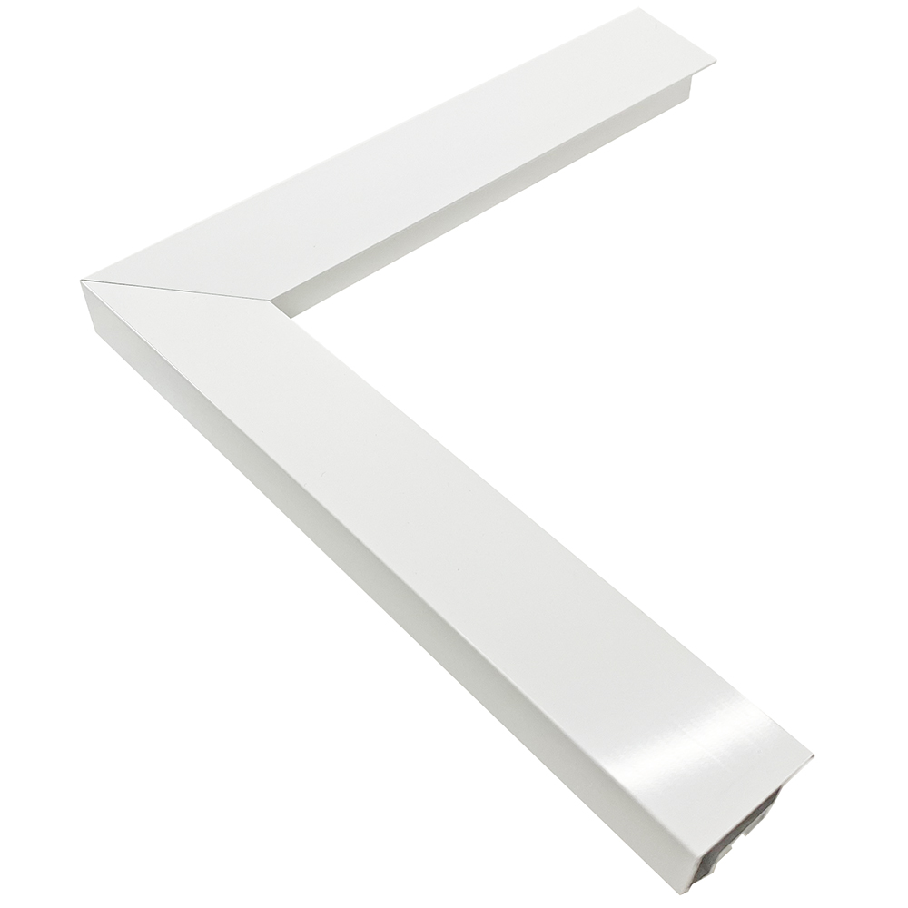 「SLICE」を特注サイズでご用意。正面側に凹凸のない、ほぼフラットな形状。フレームと中身の高低差を最小限にすることで、シームレスな仕上がりを実現しました。中身との一体感にこだわったフレームです。光沢のあるホワイトの塗装を施しました。UVカットアクリルが標準で付属します。木材に比べ、均一で安定した品質、色合いを誇ります。