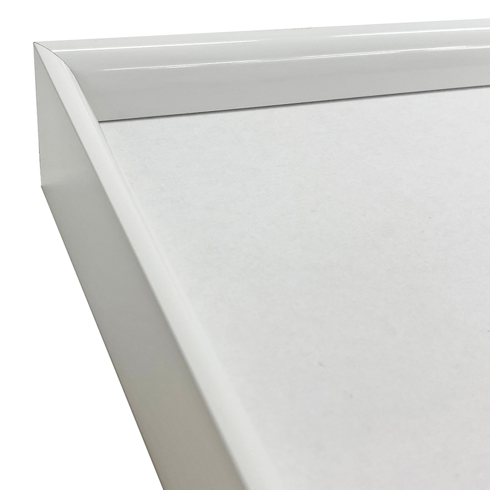 「LEAN」を特注サイズでご用意。側面が微妙に切り落とされた形状。額縁の側面が目立たず、正面に集中させます。内側の緩やかな曲線が優しい印象も与えます。光沢のあるホワイトの塗装を施しました。UVカットアクリルが標準で付属します。木材に比べ、均一で安定した品質、色合いを誇ります。