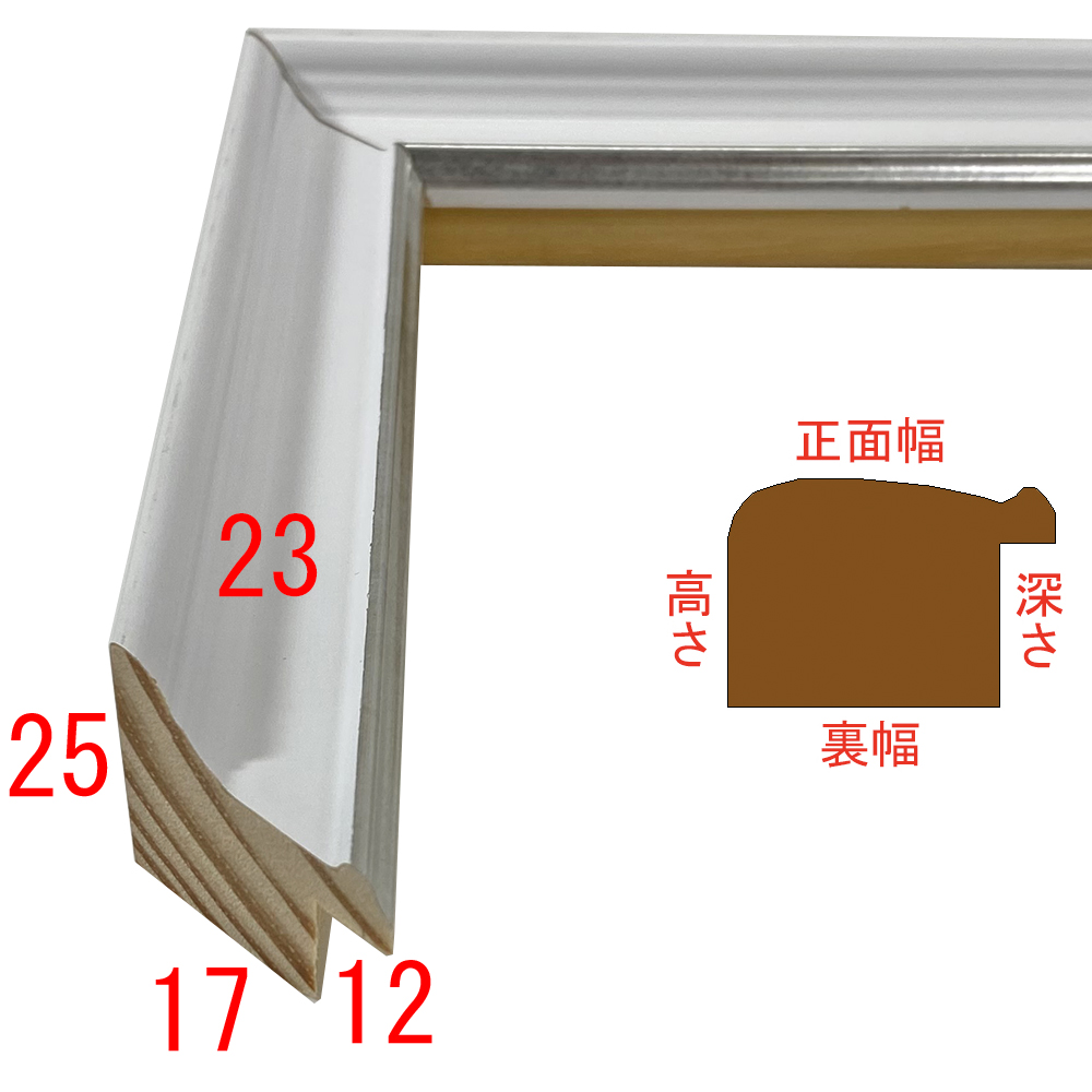 木製(パイン材)、オーダー製作専用。クラシックな形状のスペイン製フレーム。艶消しのホワイト塗装を丹念に施しました。フレーム内側の銀の面先が上品に輝きます。優雅さと落ち着きを兼ね備えたデザインです。