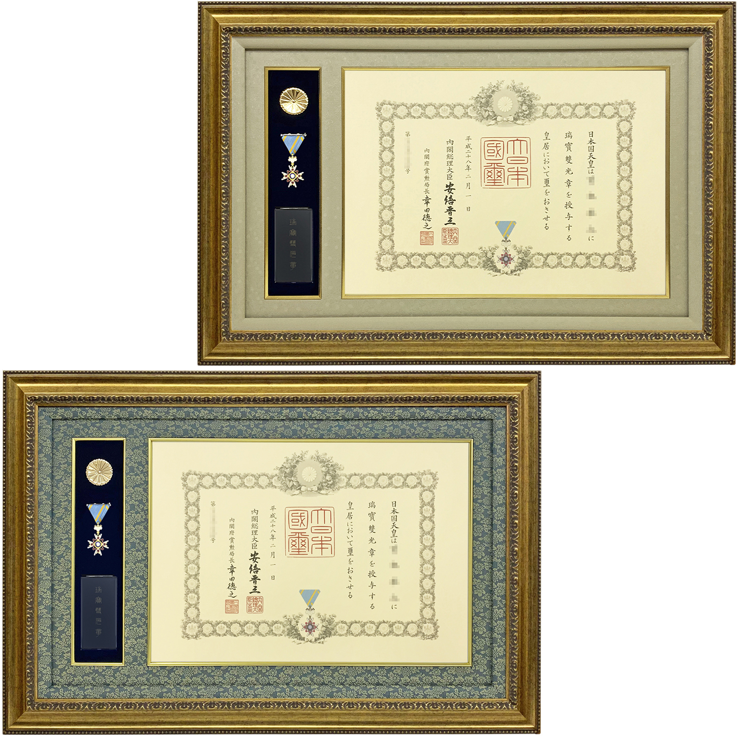 豪華な彫模様のフレームでお作りする、堂々たる叙勲額