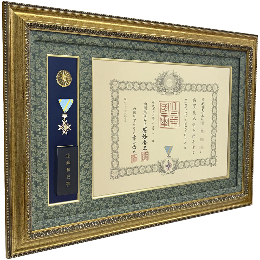 豪華な彫模様のフレームでお作りする、堂々たる叙勲額