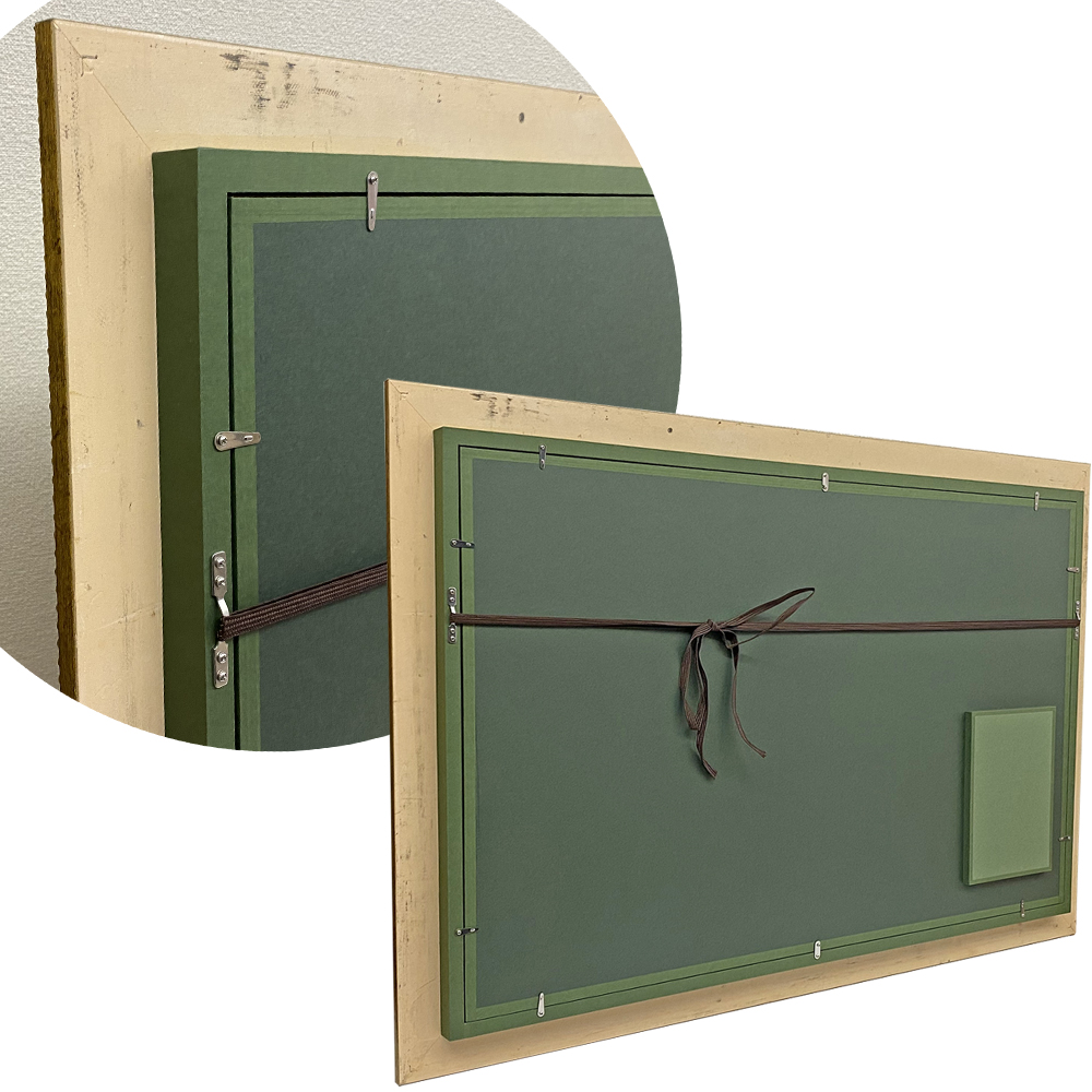 額縁と金具のセット品をご用意しております。床の間等に置く「額立てセット」が人気。和室用金具は、鴨井用と長押用があります。詳細は額縁の飾り方/和室編をご覧ください。 洋間の場合は、額吊金具だけで飾れます。金具は「石膏ボード用 Jフック」がお奨め。詳細は額縁の飾り方/基本編をご覧ください。