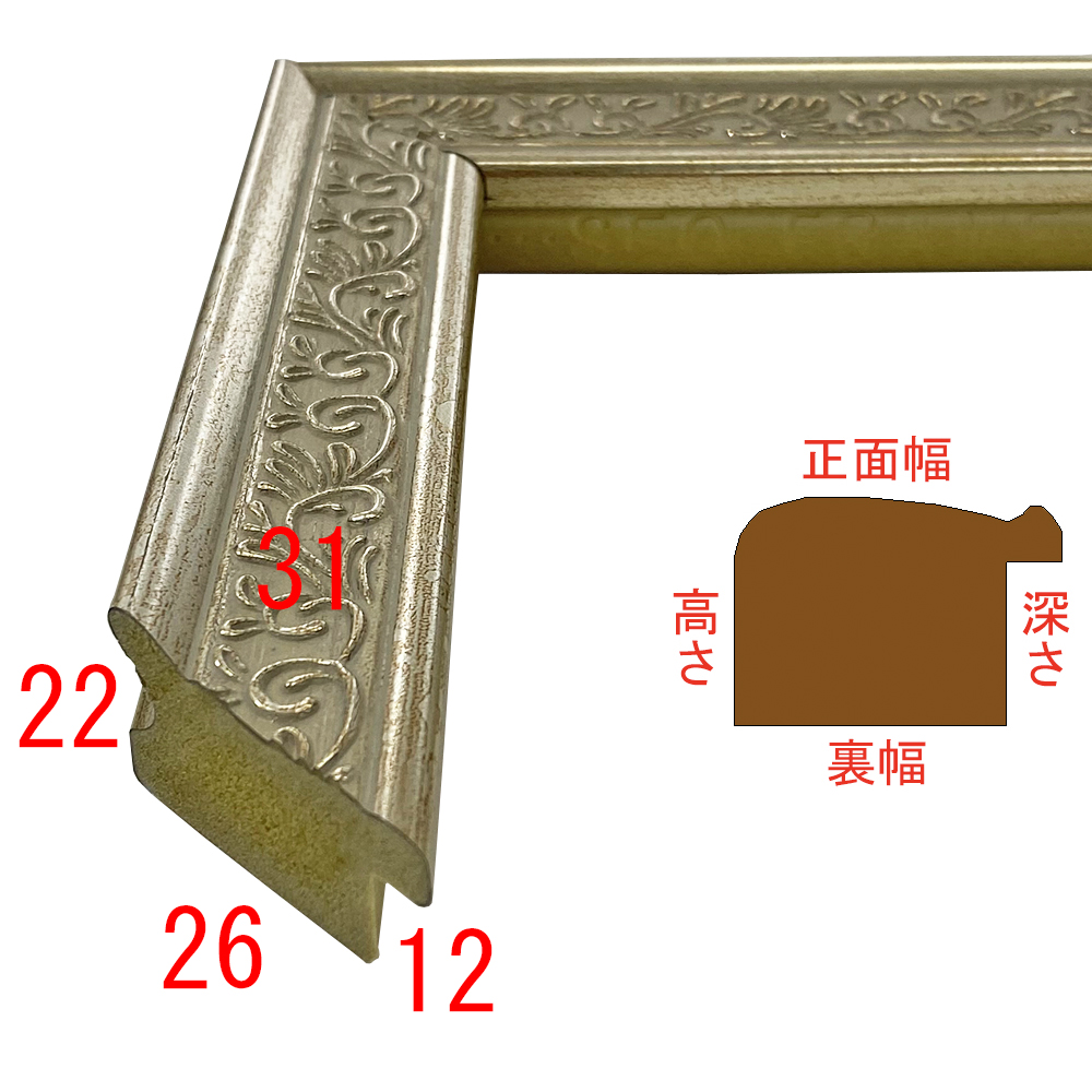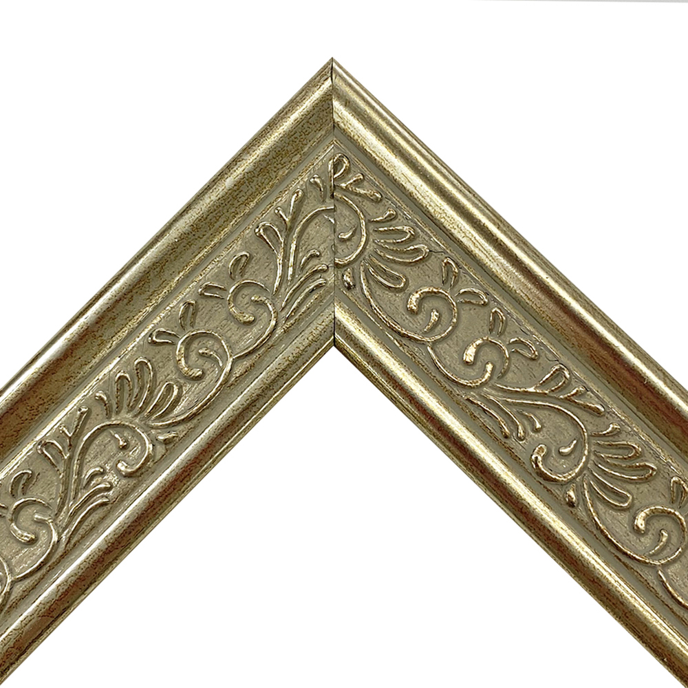 オーダー製作専用のフレーム。大柄な彫模様が入った樹脂製額縁です。適度な太さで扱いやすい、シャンパンゴールド。木材に比べ、安定した色味・質感を誇ります。