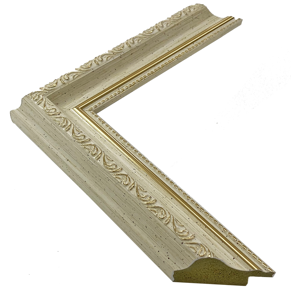 オーダー製作専用の樹脂製フレーム。木材に比べ、安定した色味・質感を誇ります。白地に繊細な金色の模様が映える額縁です。高低差がメリハリのある額装を作ります。