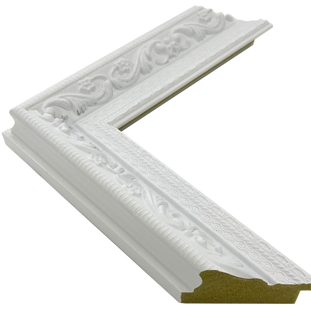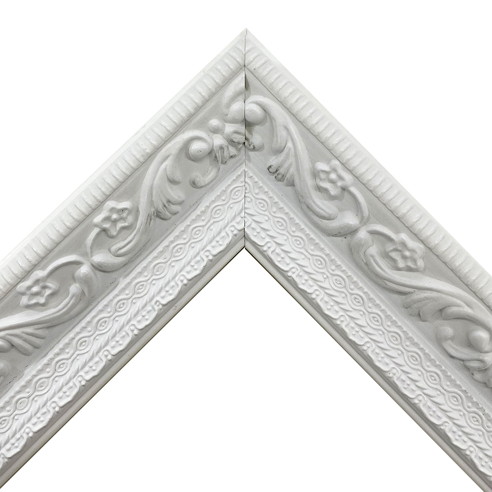オーダー製作専用の樹脂製フレーム。木材に比べ、安定した色味・質感を誇ります。余裕のある太さとデコラティブな模様が目を引く。艶消しホワイトのハイソな印象の額縁です。