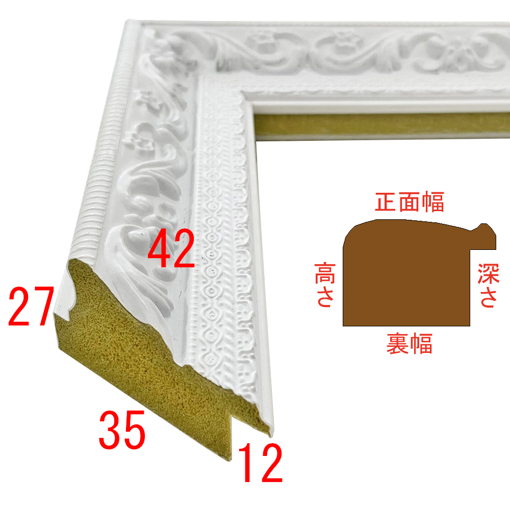 彫模様の上に艶消しホワイトを乗せた、ハイソな印象の額縁です