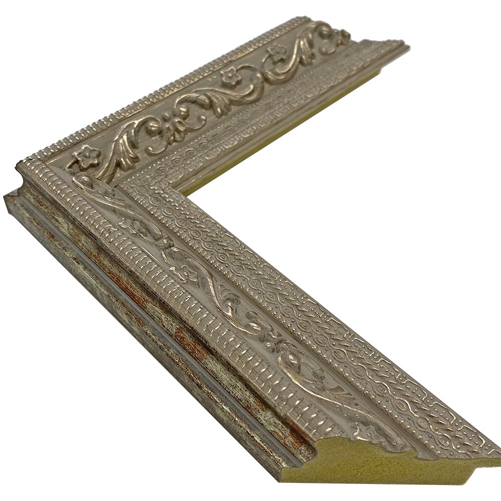 余裕のある太さとデコラティブな模様が目を引くシルバーフレーム