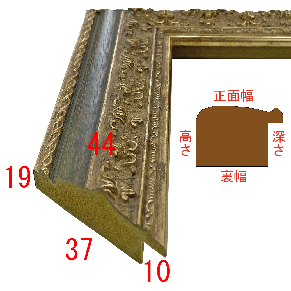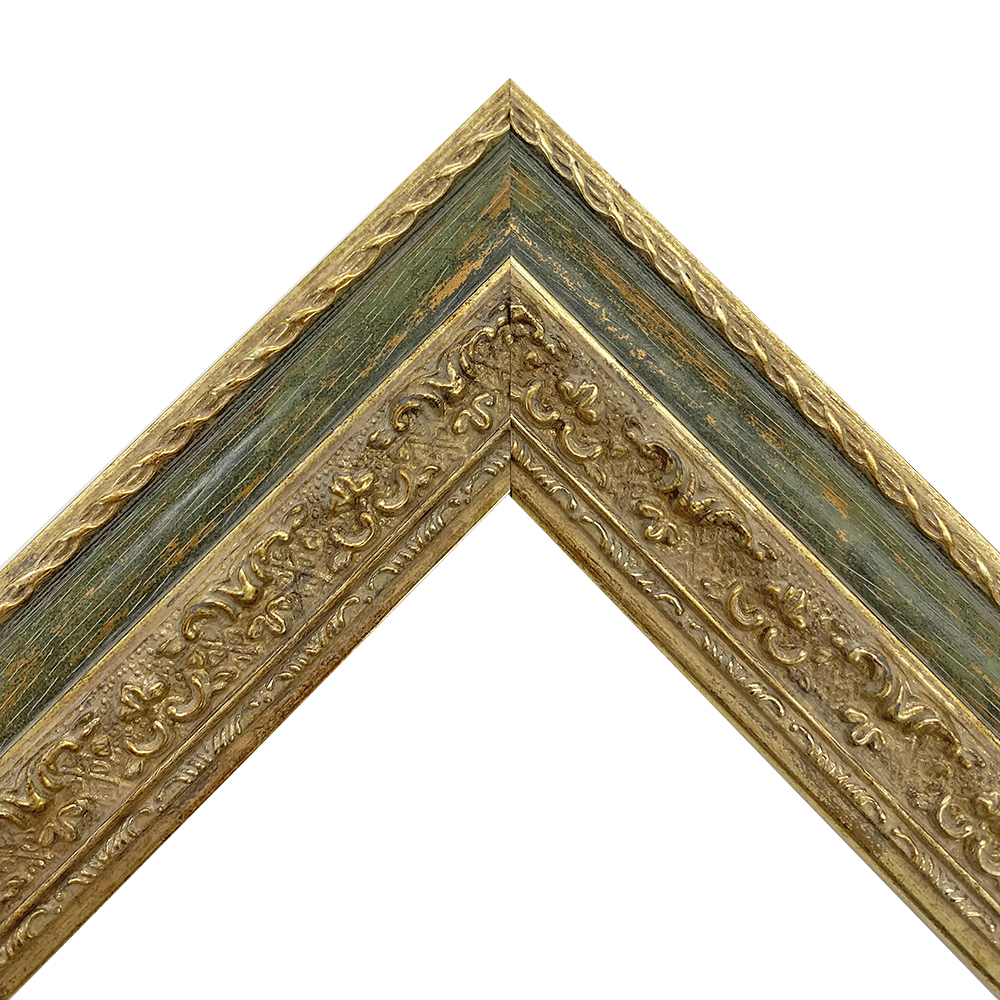 オーダー製作専用の樹脂製フレーム。アンティークな緑と金の組み合わせが目を引く。古代文明を思わせる特徴的な模様も特徴です。木材に比べ、安定した色味・質感を誇ります。