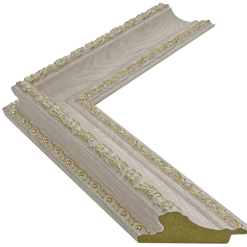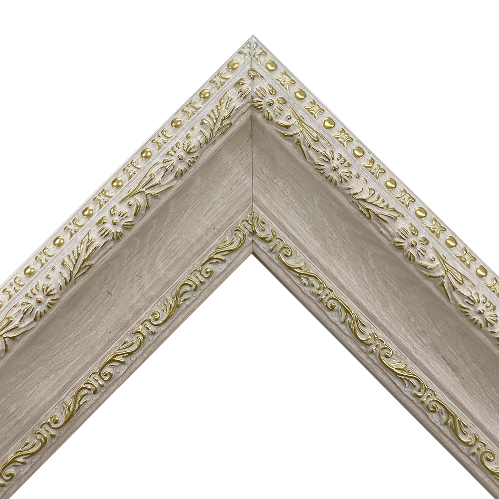 オーダー製作専用のフレーム。大胆に高低差を付けた樹脂製の額縁です。白と金の組み合わせが控えめで上品な印象。木材に比べ、安定した色味・質感を誇ります。