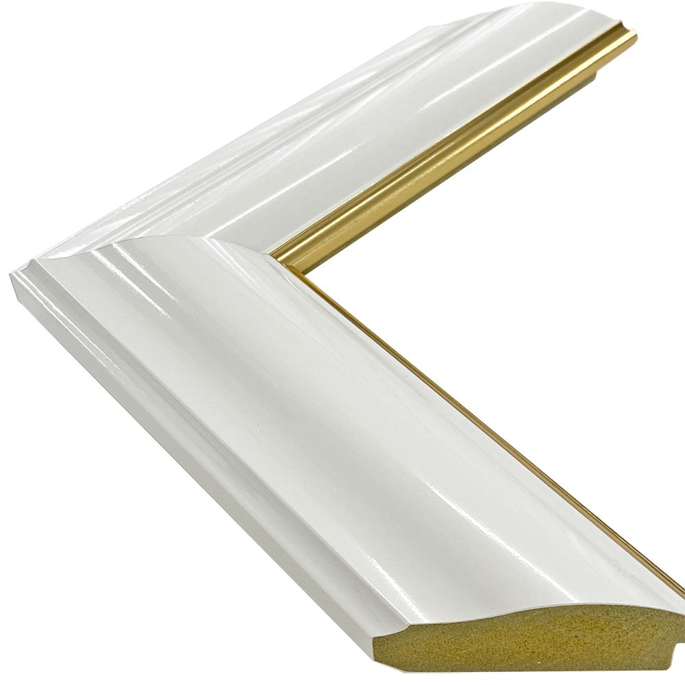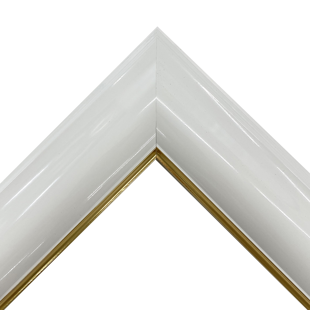 オーダー製作専用の樹脂製フレーム。木材に比べ、安定した色味・質感を誇ります。艶やかなホワイトにゴールドのアクセントが輝く。時代を超えて親しまれるデザインの額縁です。