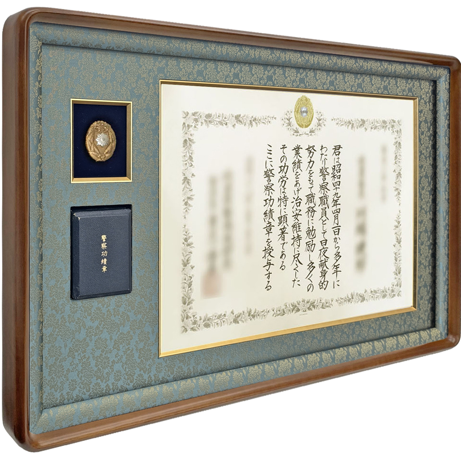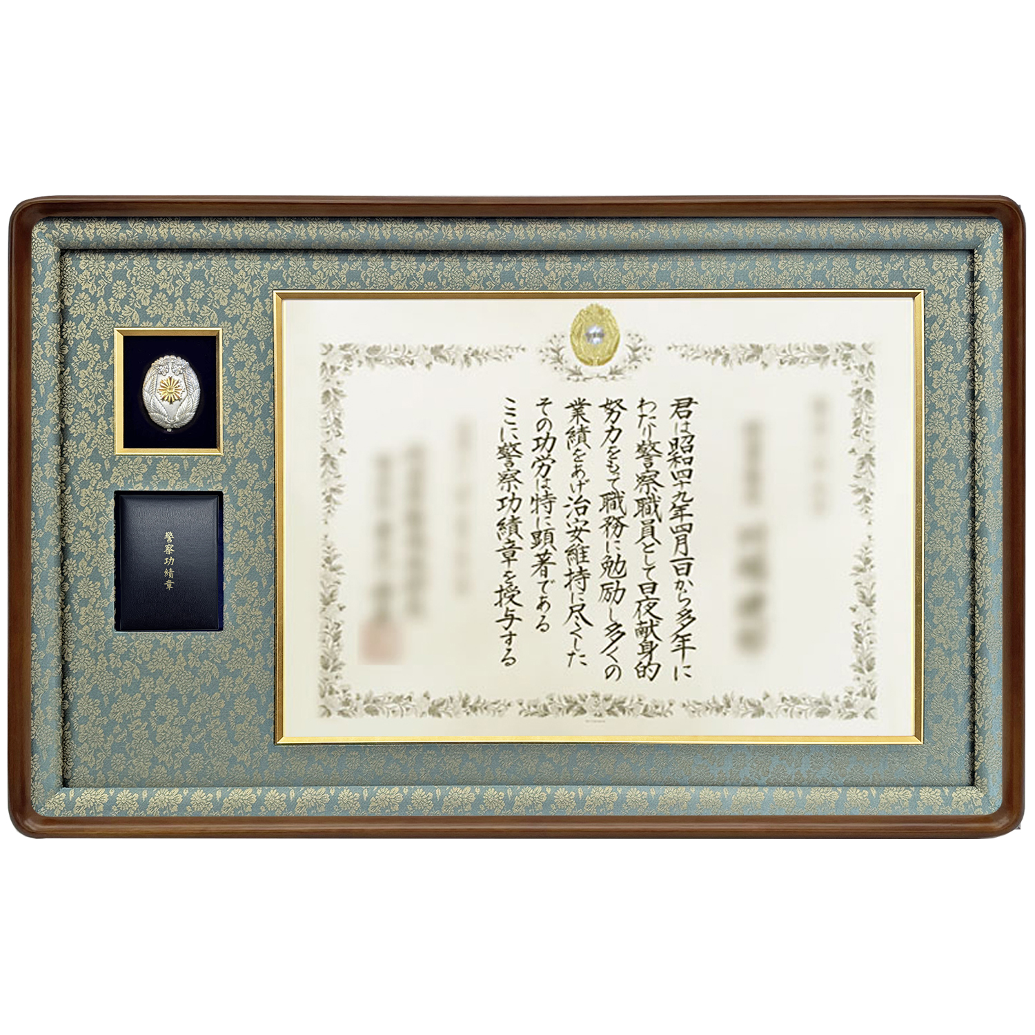 警察表彰専用の本格隅丸和額、章のケースも一緒に飾れます
