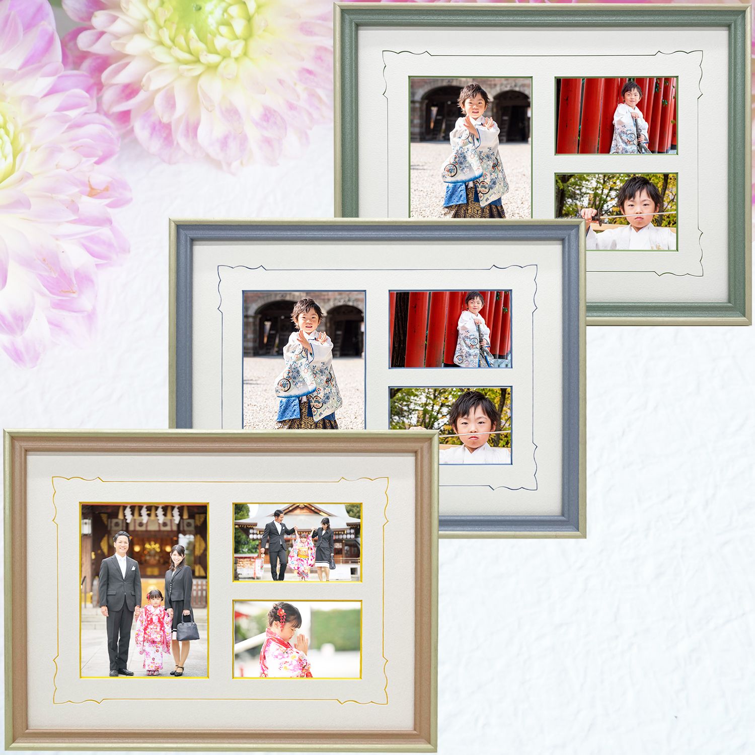 こちらは、写真3枚を一つのフレームに飾れる七五三専用額。