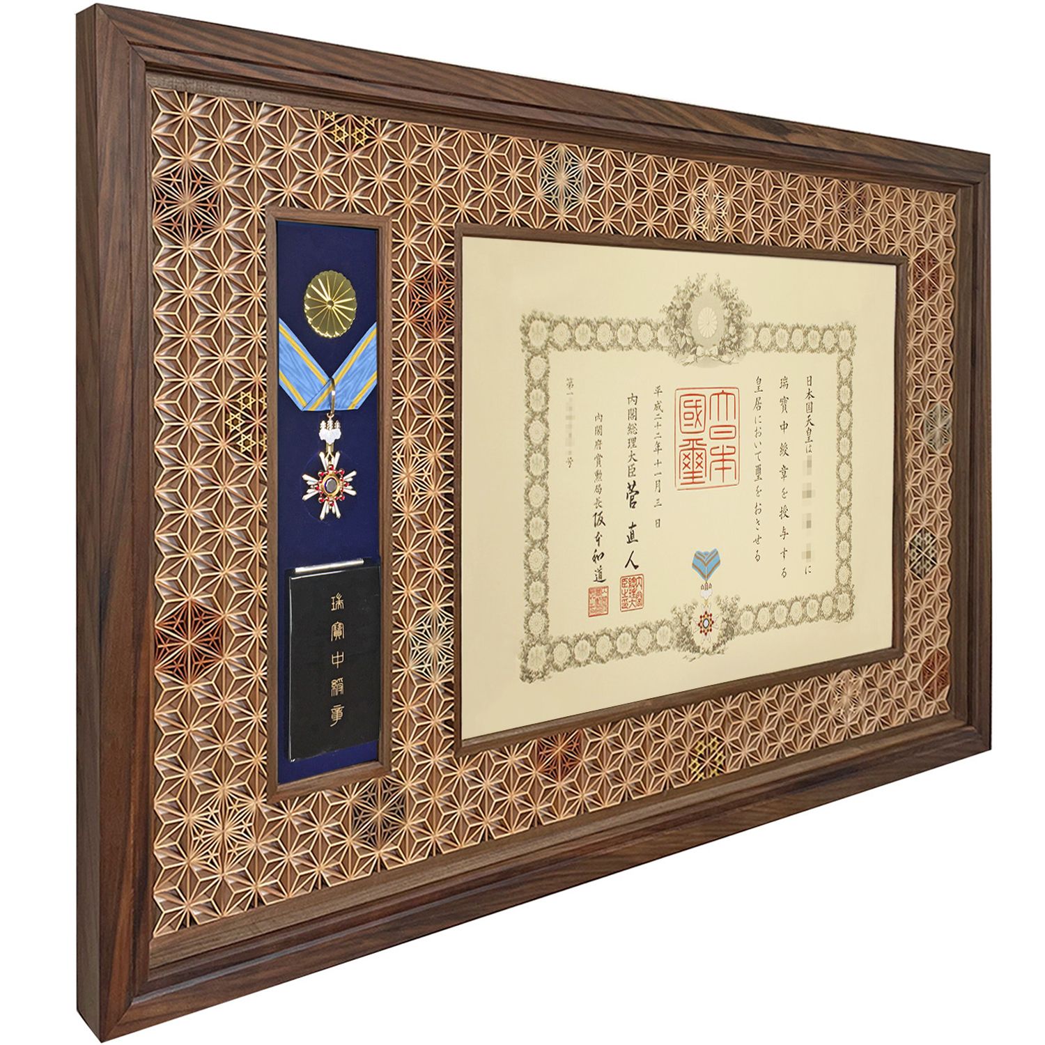 神代木と【八重麻の葉】の組子柄を融合、中綬章専用叙勲額