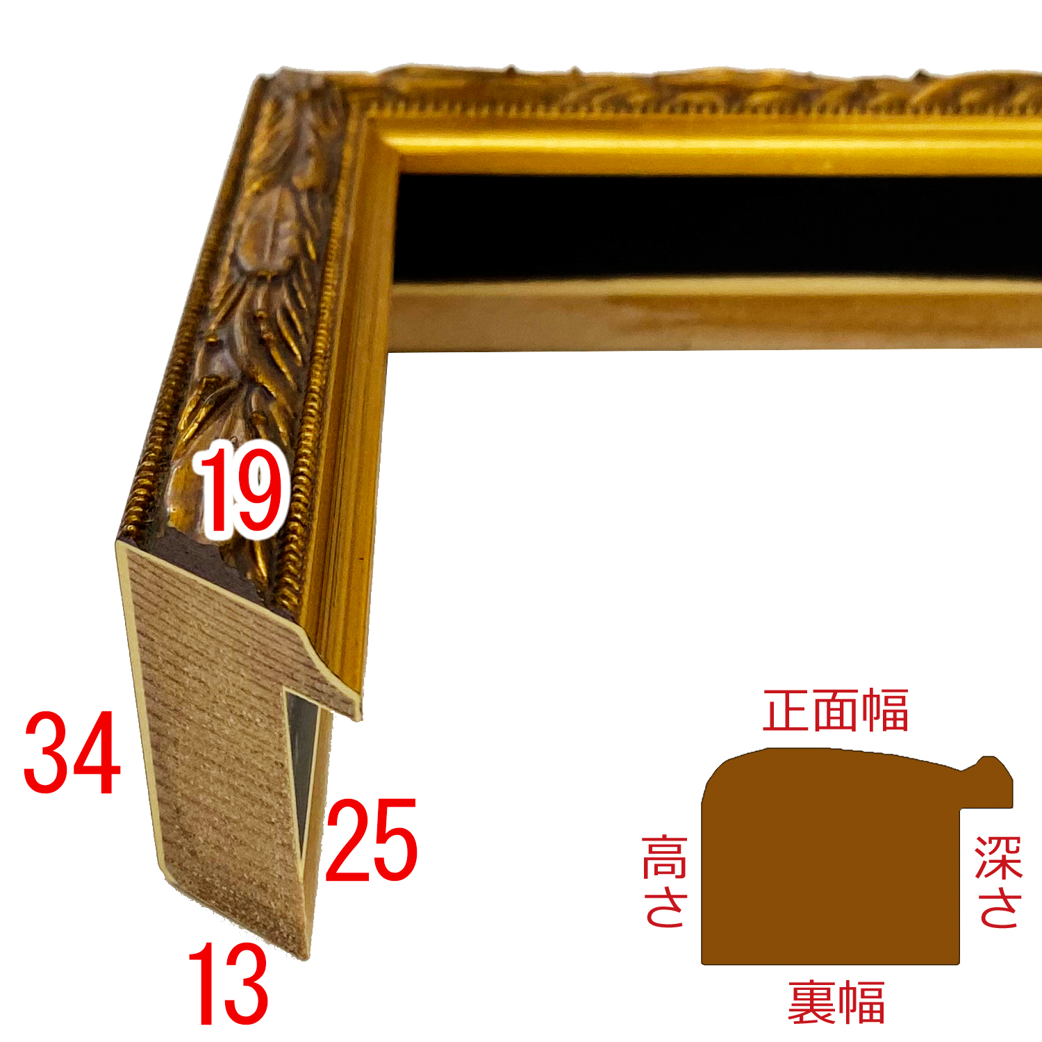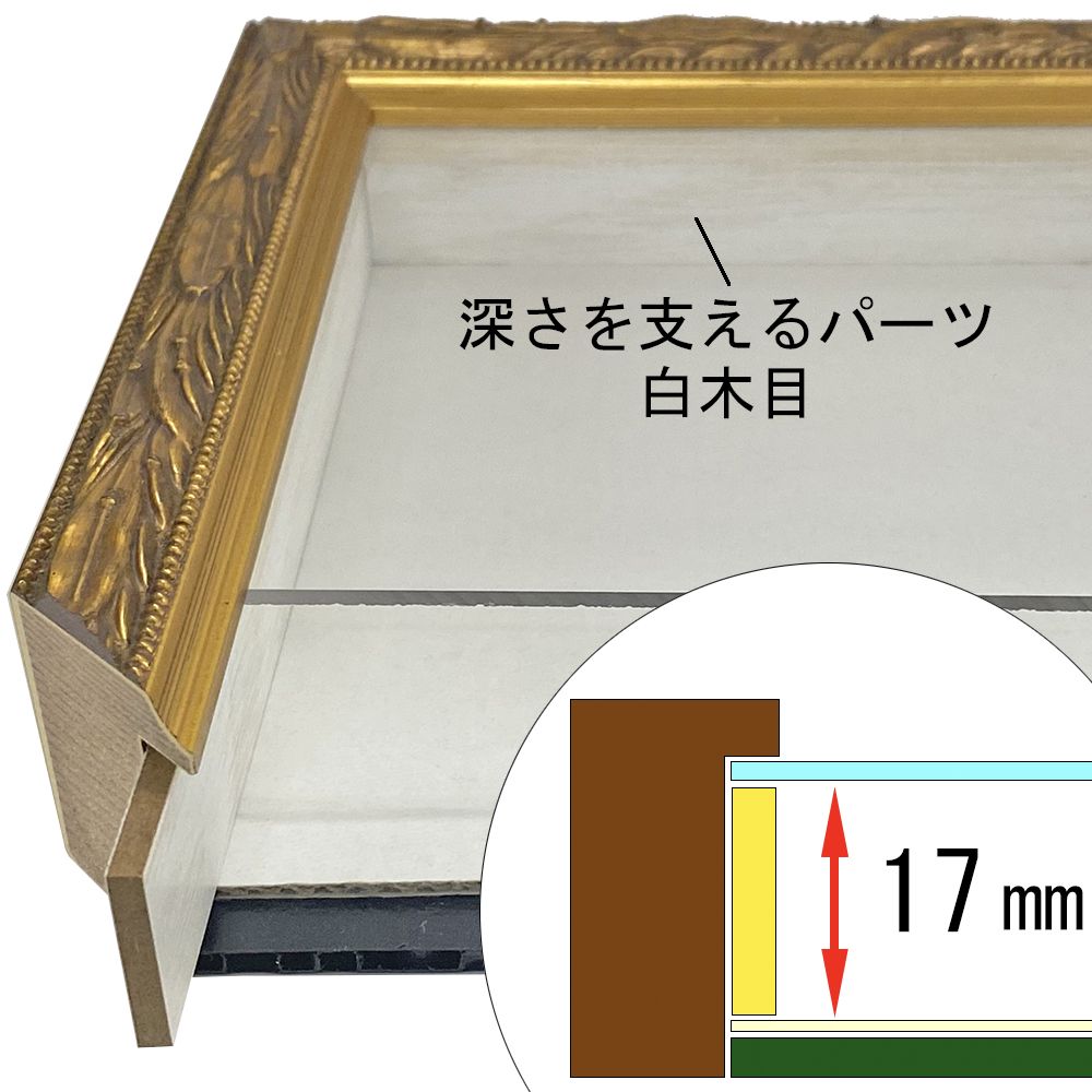 このフレームは「フレーム深さを活かした立体額」の製作も可能です。上の画像では、「フレーム深さを活かした立体額」を製作した場合の、額縁内部深さや深さを支えるパーツの色も紹介しておりますが、オーダーフレームの仕様によって額縁の構造は変わりますのでご注意ください。