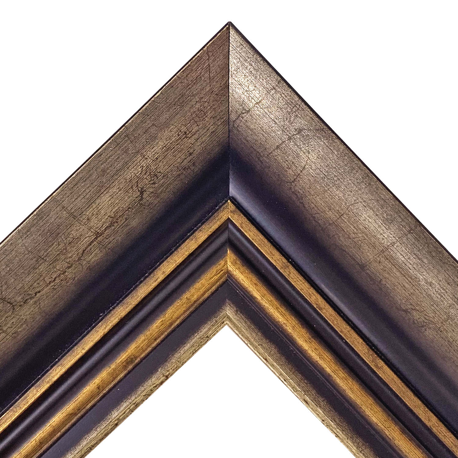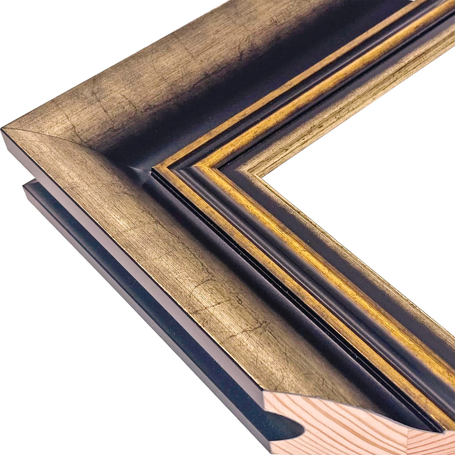 木製(パイン材)。オーダー製作専用フレーム。ひび割れ模様のあるゴールドフレーム。汚し加工が施されたいぶし銀の色合いで、高級感のある仕上がりになります。