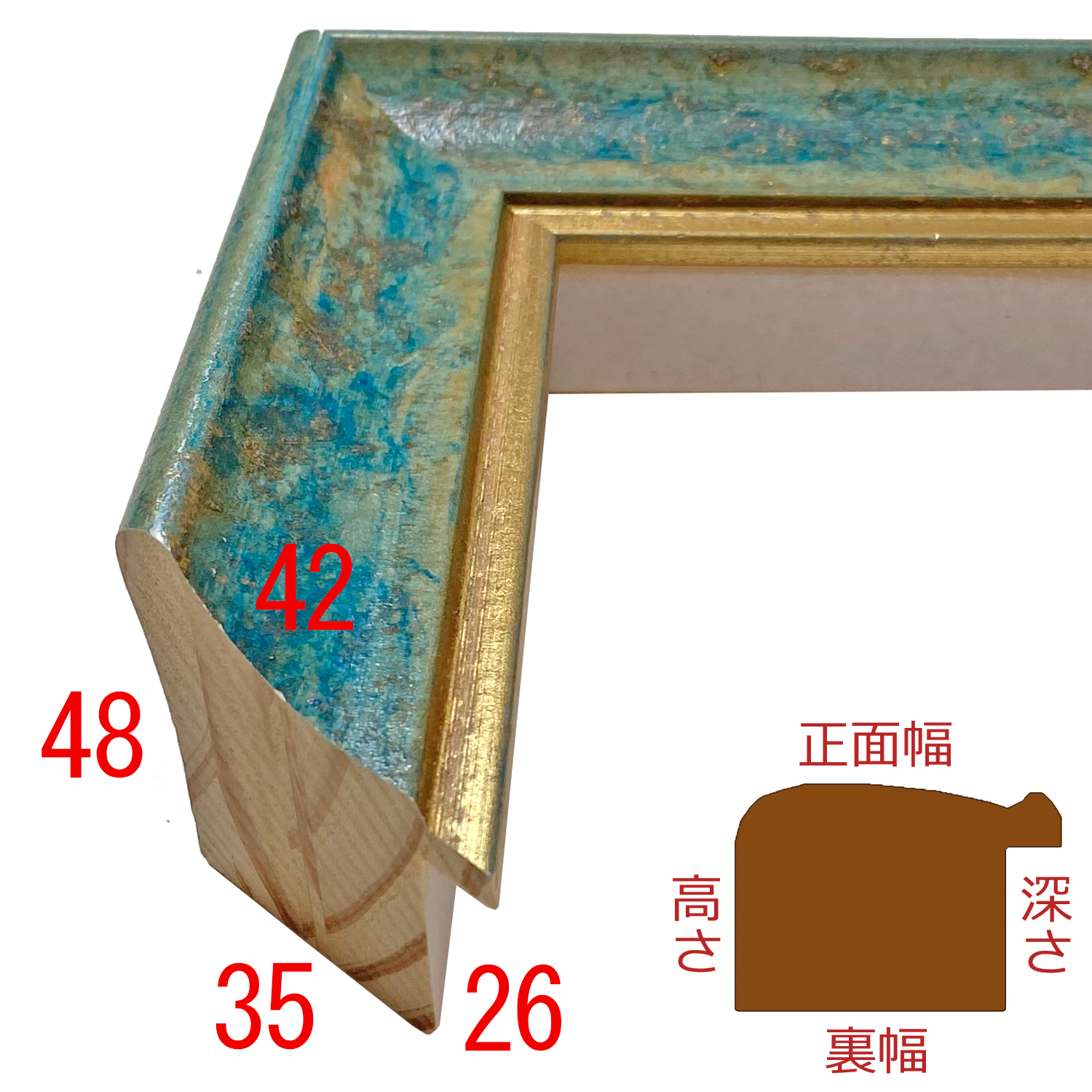 このフレームは「フレーム深さを活かした立体額」の製作も可能です。上の画像では、「フレーム深さを活かした立体額」を製作した場合の、額縁内部深さや深さを支えるパーツの色も紹介しておりますが、オーダーフレームの仕様によって額縁の構造は変わりますのでご注意ください。