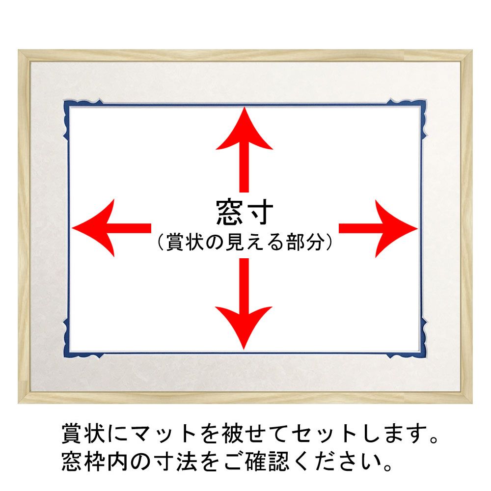 この額縁は窓抜きされたマットが付属します。デザインカットが施されたマットで、大切な賞状を格調高く飾りましょう。 賞状にマットを被せて額縁にセットします。下部表のマット窓抜寸法をご確認ください。「窓寸」が賞状の見える部分になります。賞状固定用の専用テープも付属しますので、マット裏面に賞状をセットしてください。